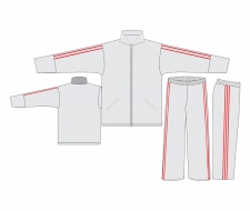 Descritivo; Conjunto jaqueta raglã, com faixas nos ombros e calça com faixas laterais, punhos e cos de ribana