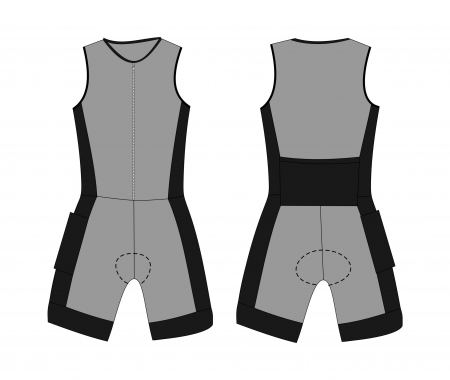 Descritivo; Macaquinho para ciclismo, sem manga, recorte lateral, e barras em segunda cor, fechamento com ziper